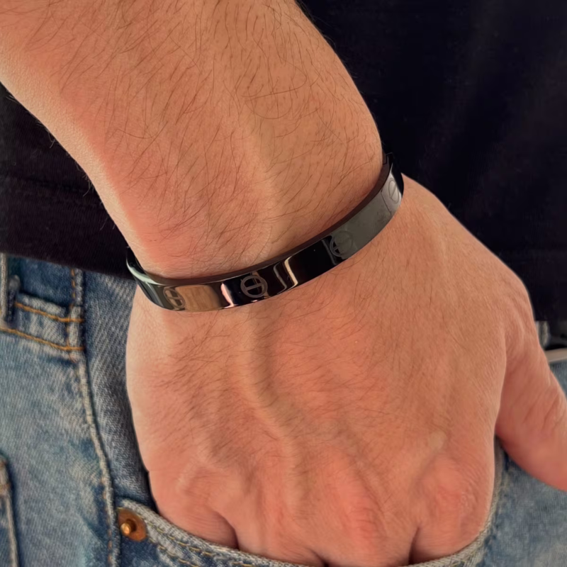 O Bracelete Velluto em Aço Inox Preto é a peça ideal para quem busca estilo urbano, minimalista e poderoso. Com acabamento escurecido e design liso, ele traduz força e sofisticação em um só acessório.