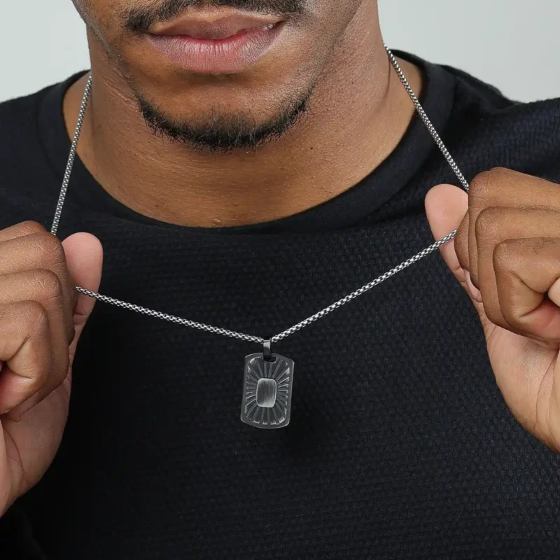Design Sofisticado e Moderno: O pingente grafite de 2 cm x 3 cm é o destaque do Colar Vittoria. Com um design estiloso e acabamento polido, o pingente traz um contraste elegante com a corrente prateada, adicionando um toque de modernidade ao visual.