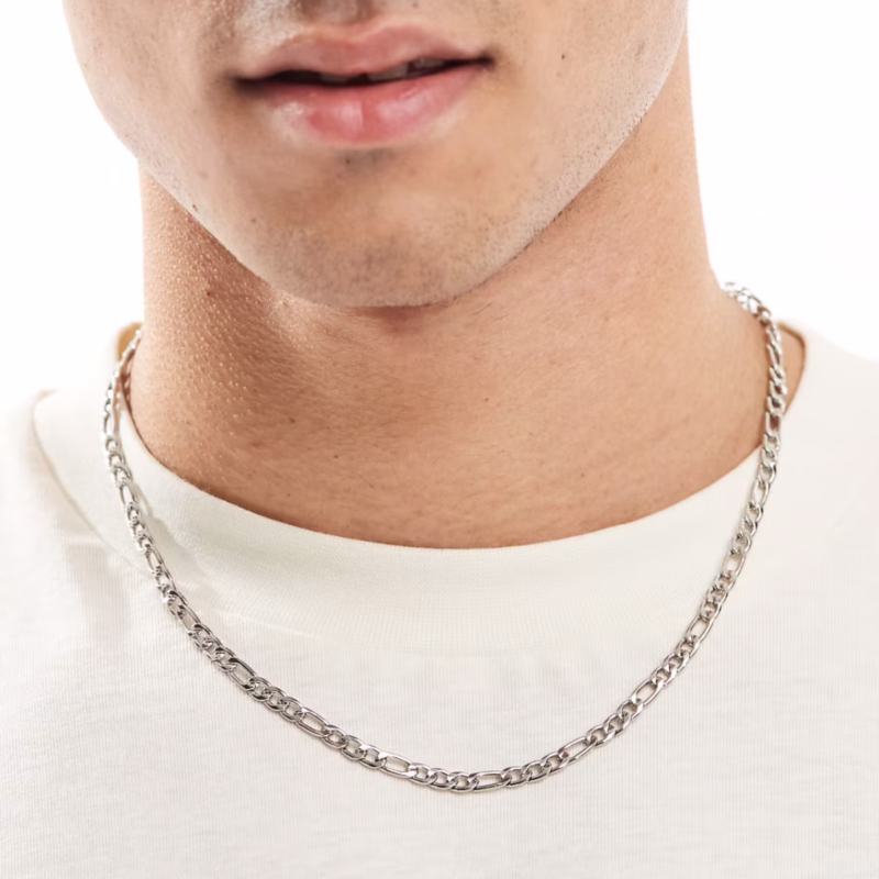 O padrão Figaro combina elos longos e curtos em um ritmo visual sofisticado, criando um efeito dinâmico e discreto ao mesmo tempo. Seu acabamento prateado é perfeito para compor desde looks casuais até produções mais refinadas.