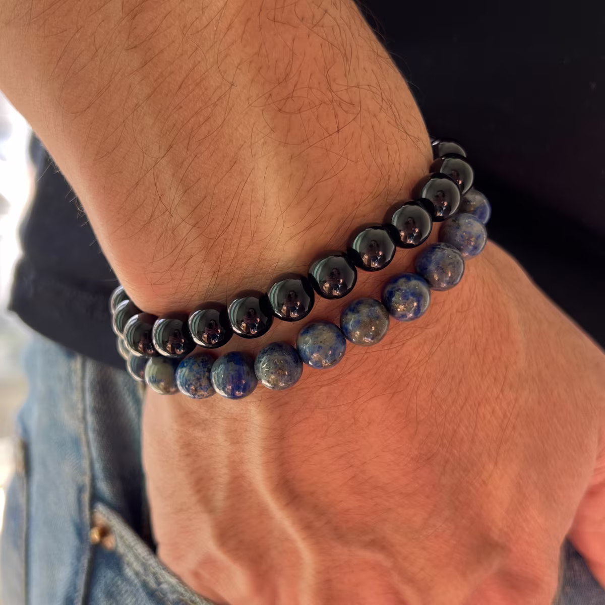 O Ônix é reconhecido por transmitir proteção e foco, enquanto o Lápis-Lazúli carrega propriedades de sabedoria, clareza mental e energia positiva. Juntas, essas pedras criam um equilíbrio perfeito entre proteção e inspiração para o seu dia a dia.