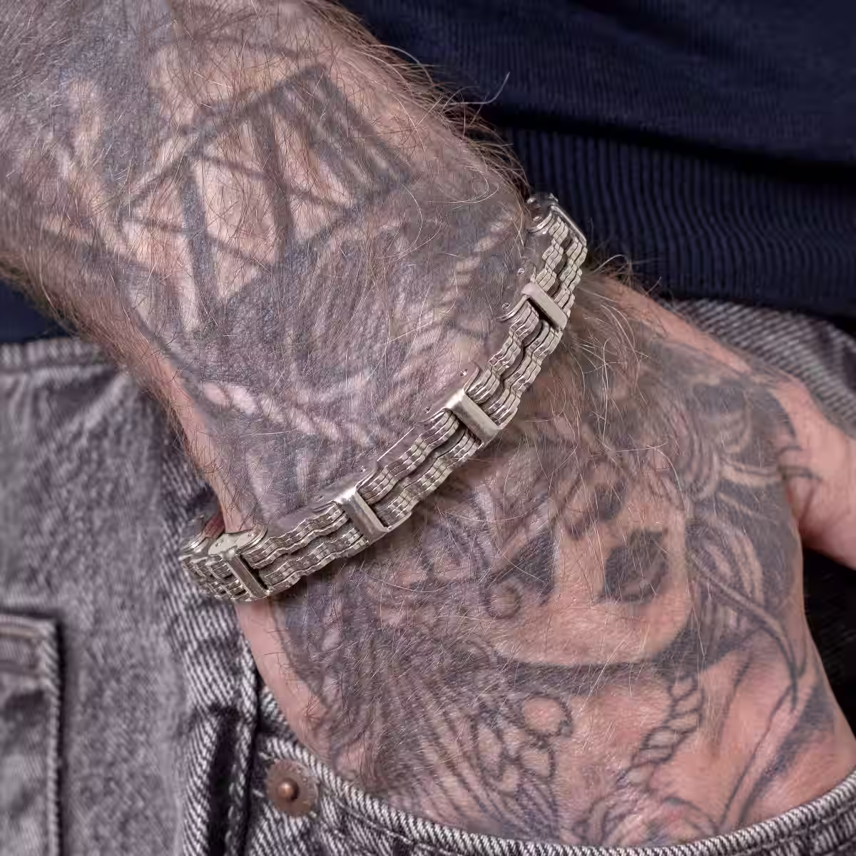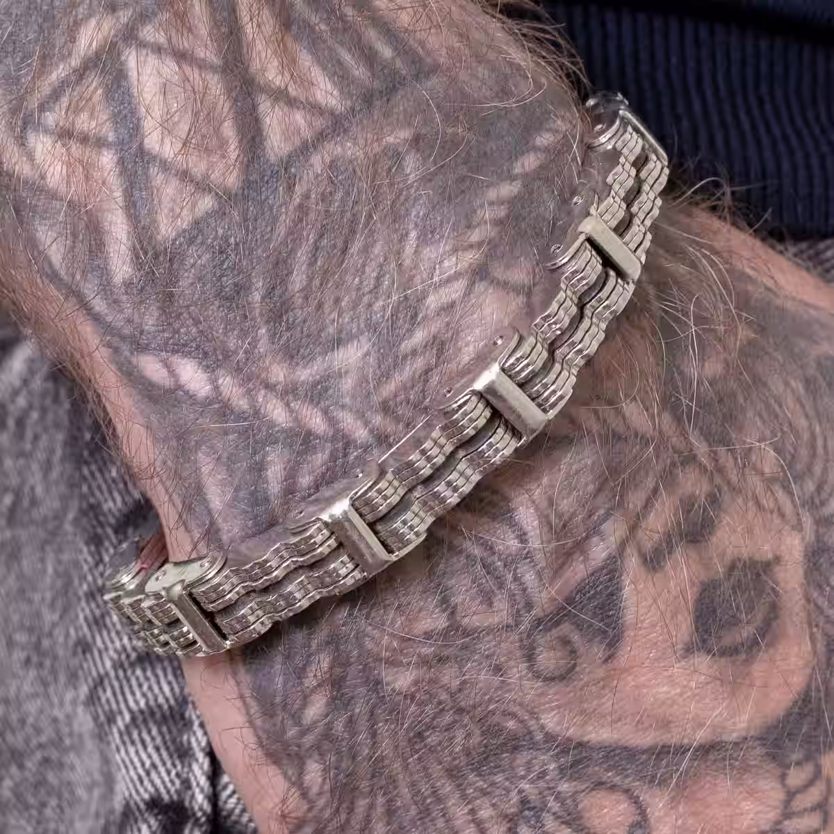 O formato encadeado e o acabamento prateado conferem à pulseira um visual moderno e elegante, ideal para quem deseja um acessório que se destaque com força e personalidade.