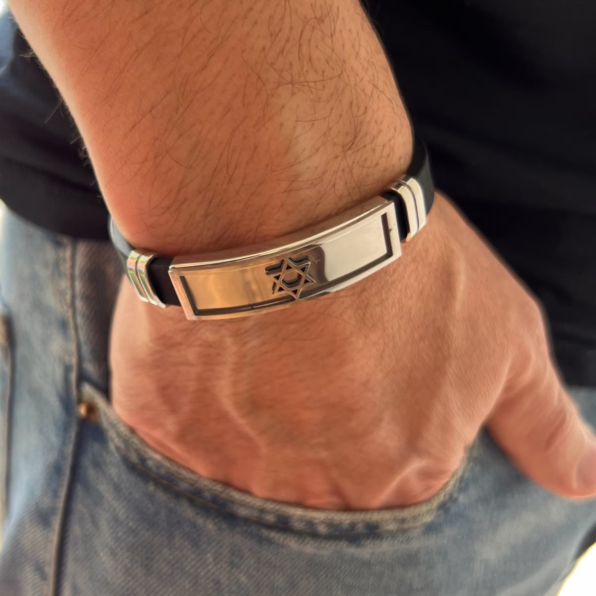 A combinação do preto fosco com o brilho do aço cria um contraste elegante e atual. A Estrela de Davi confere identidade e significado ao acessório, perfeito para quem busca expressar valores e estilo de forma discreta e sofisticada.