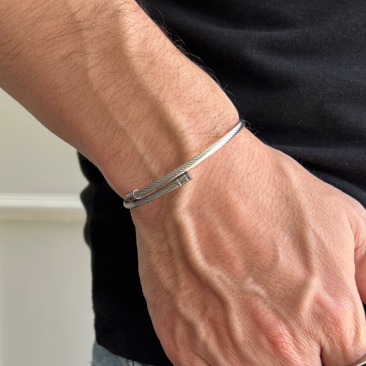 Esta peça exclusiva é confeccionada com maestria a partir do aço inoxidável de mais alta qualidade, que é meticulosamente moldado em um cabo entrelaçado de precisão. A textura suave e polida do cabo de aço adiciona uma dimensão única à pulseira, proporcionando um toque tátil e visual irresistível.
